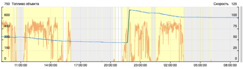 С проведенной тарировкой и корректной настройкой датчика уровня топлива в системе мониторинга (Wialon, ГЛОНАСССофт) график топлива должен иметь вид как на рисунке ниже, а заправки сходиться с высокой точностью. Бывают случаи, когда некоторые недобросовестные исполнители тарируют баки механическими счетчиками, либо с помощью канистр. Ни о какой точности в этом случае не может быть и речи.