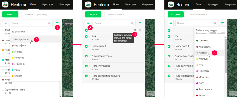 В приложении Wialon Hecterra добавили возможность массового изменения полей и массового указания посевов культур, которые засеяны на полях. Это позволит быстрее и комфортнее производить эти манипуляции.