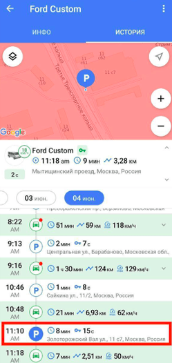 На вкладке «История» появилась информация о зажигании. Для стационарных объектов зажигание показывается в разделе истории поездок. Для объектов с треками – во время парковки.