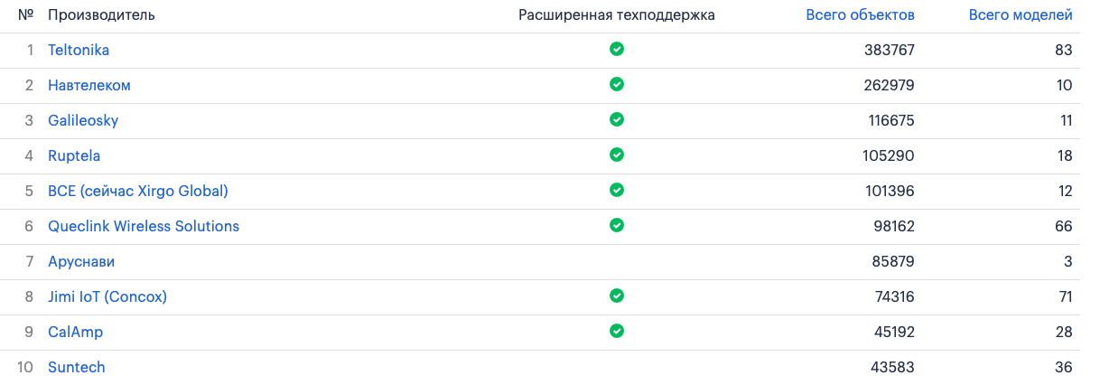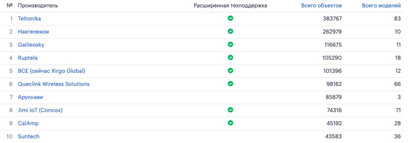 В таблице ниже показаны лидеры рейтинга производителей оборудования для спутникового отслеживания транспорта GPS/ГЛОНАСС. Ознакомиться с ним подробнее и сделать заказ можно в нашем КАТАЛОГЕ.