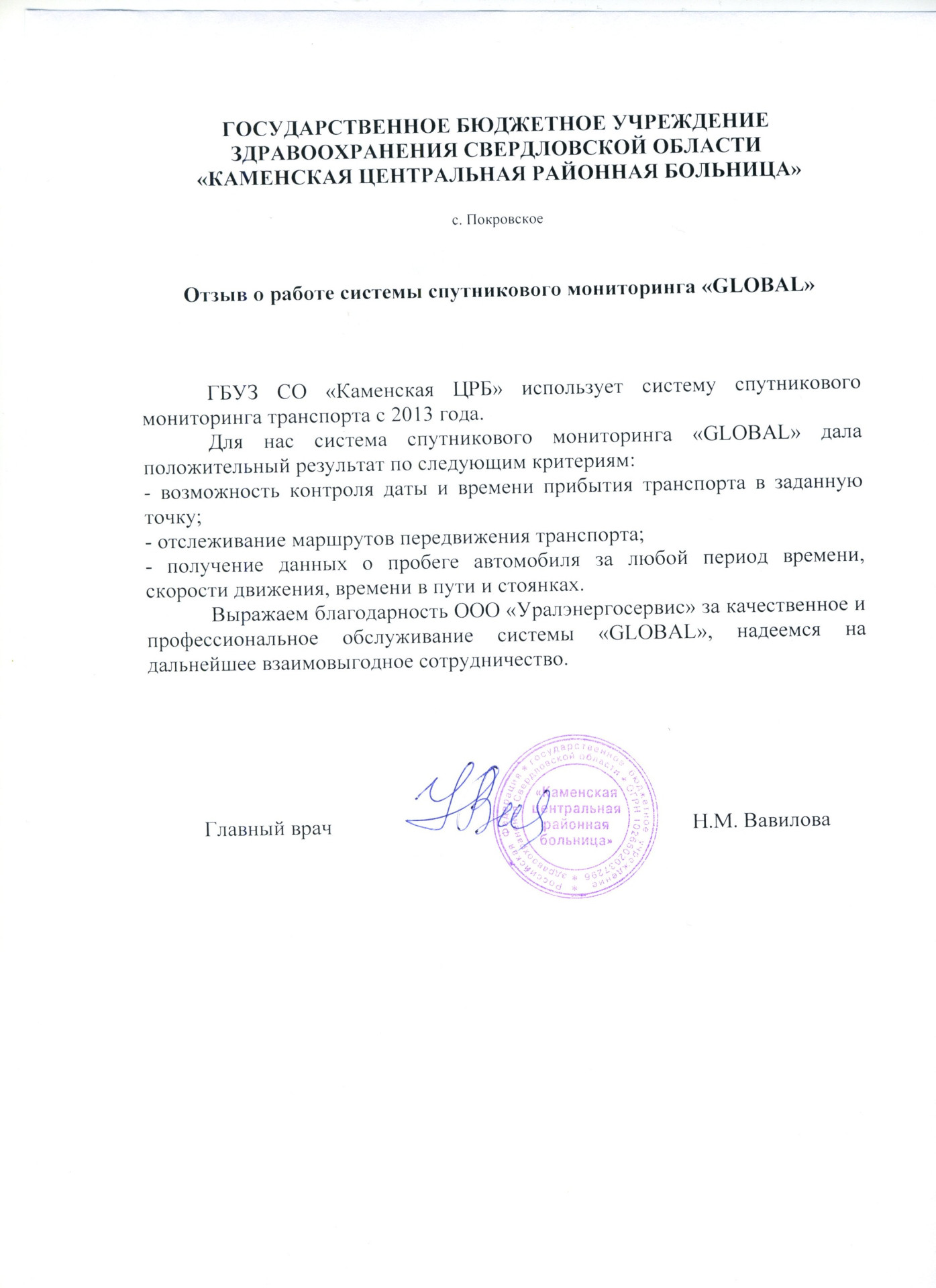 ГБУЗ СО «Каменская ЦРБ» использует систему спутникового мониторинга транспорта с 2013 года.