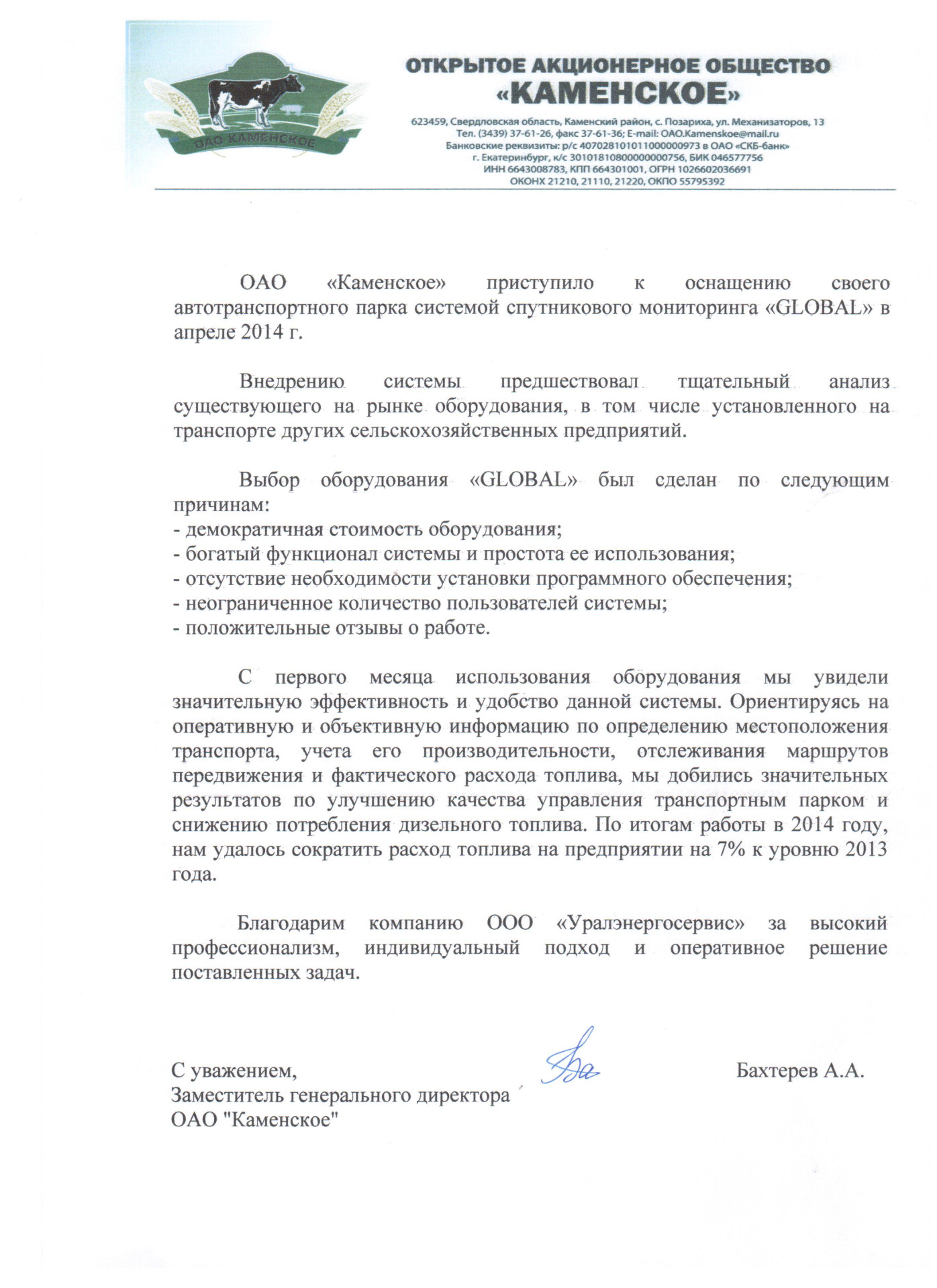 ОАО «Каменское» приступило к оснащению своего автотранспортного парка системой спутникового мониторинга «GLOBAL» в апреле 2014 г.